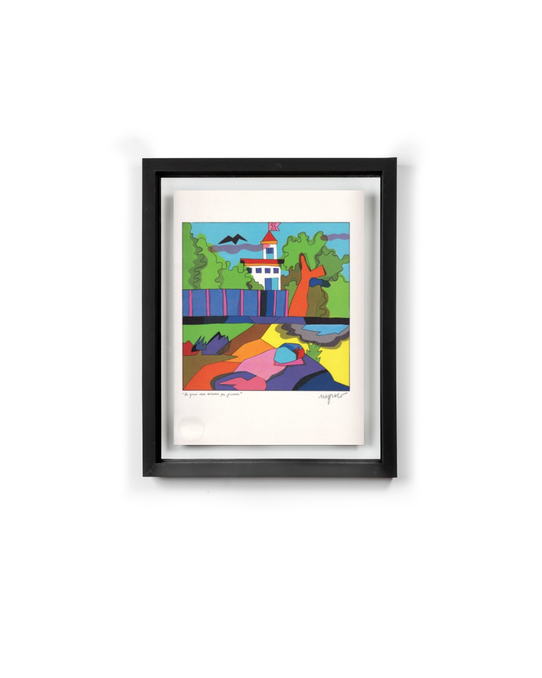 Ugo Nespolo (Mosso 1941) “Per gioco una dimora per giocare”. Fotolitografia. Dimensioni opera 23,5×30. Firmato in basso a destra. Numerato sul retro
